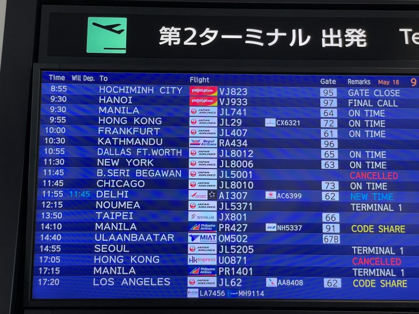ทริปนี้ใช้เวลาในการบินรวมกับเวลาที่ใช้รอเปลี่ยนเครื่องเกือบ 20 ชั่วโมงเลย เราเริ่มต้นจากสนามบินสุวรรณภูมิ แล้วไปเปลี่ยนเครื่องที่สนามบินนาริตะ ประเทศญี่ปุ่น ด้วยสายการบิน JAL ขาแรกใช้บินเวลาประมาณ 6 ชั่วโมง