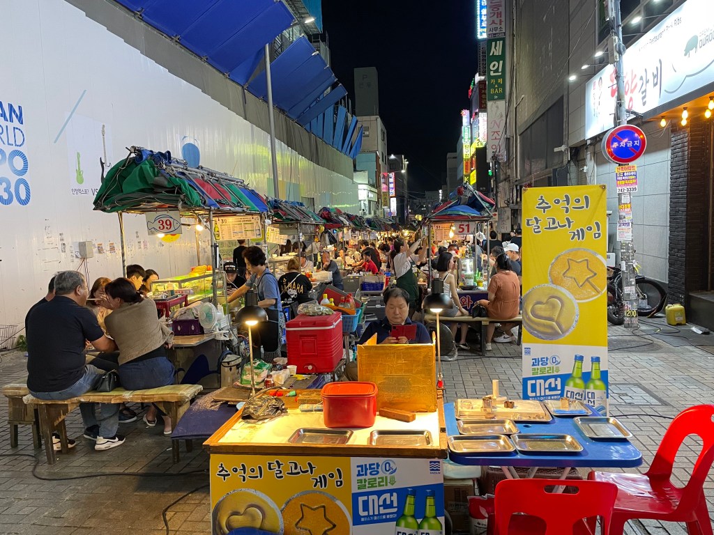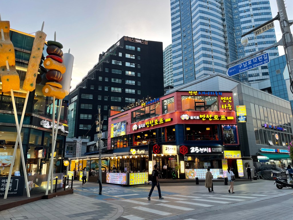 ถนนเทศกาลหนังนานาชาติเมืองปูซาน หรือชื่อเต็มก็คือ “Busan International Film Festival“ มีมาตั้งแต่ปีค.ศ. 1996 ถนนเส้นนี้สามารถเดินทะลุมาได้จากถนนชอปปิ้งนัมโพดง (Nampodong Street) ที่นี่เต็มไปด้วยสตรีทฟู้ดเกาหลีแท้ๆ ไม่ว่าจะเป็น ข้าวปั้นห่อสาหร่าย หรือ “คิมบับ” โอเด้ง ไส้กรอกเลือด เกี๊ยวทอด ต็อกโบกี เยอะแยะไปหมด ใครที่ชอบเดินไปด้วย กินไปด้วย ต้องมาที่นี่เลย ที่สำคัญคือ ของกินในย่านนี้ราคาไม่แพง แถมได้รสชาติต้นตำหรับสุดๆ