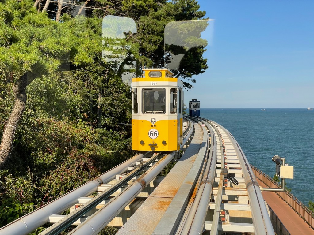 Blueline Park สถานี Mipo เป็นจุดขึ้นรถไฟ Sky Capsule ซึ่งอยู่ไม่ไกลจากหาดแฮอุนแด สามารถเดินมาได้เลย รถไฟจะมีให้เราเลือกสอบแบบก็คือ แบบ Sky Capsule เป็นตู้ส่วนตัวเล็กๆ สำหรับ 2 – 4 คน และอีกแบบก็คือ Beach Train จะเป็นรถไฟขบวนยาว นั่งหันหน้าออกทะเล ทั้งสอบแบบมีราคาแตกต่างกัน และระยะทางก็จะต่างกันด้วย