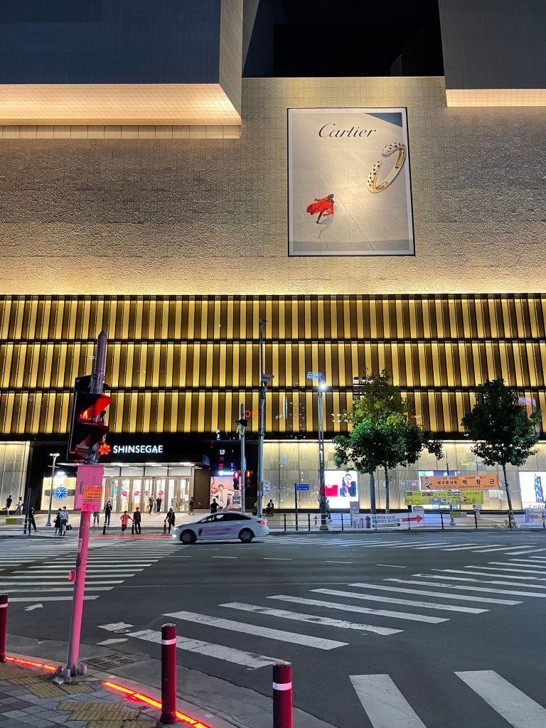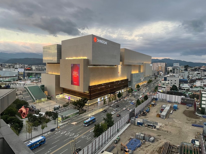ใครที่นั่งรถไฟมาจากปูซาน จะสามารถเลือกลงสถานีปลายทางได้ 2 สถานีก็คือ Daegu เลย ซึ่งจะเป็นใจกลางเมืองพอดี หรือสถานี Dongdagu ซึ่งถัดมา 1 สถานี ก็จะออกมานอกเมืองนิดหน่อย ย่านนี้มีห้างสรรพสินค้า Shinsegae ที่ใหญ่มาก ออกมาจากสถานีก็จะเจอเลย เป็นห้าง Hi-End มีร้าน Brandname ทุกแบรนด์