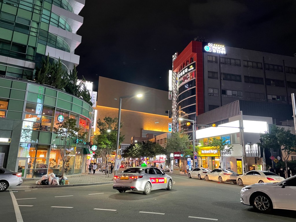 นอกจากห้าง Shinsegae แล้ว บริเวณตรงข้ามห้างก็จะมีถนนที่เต็มไปด้วยร้านปิ้งย่าง และเป็นแหล่งสังสรรค์ยามค่ำคืนอีกด้วย ส่วนคาเฟ่ก็จะมีบ้าง แต่ไม่ได้เยอะมาก
