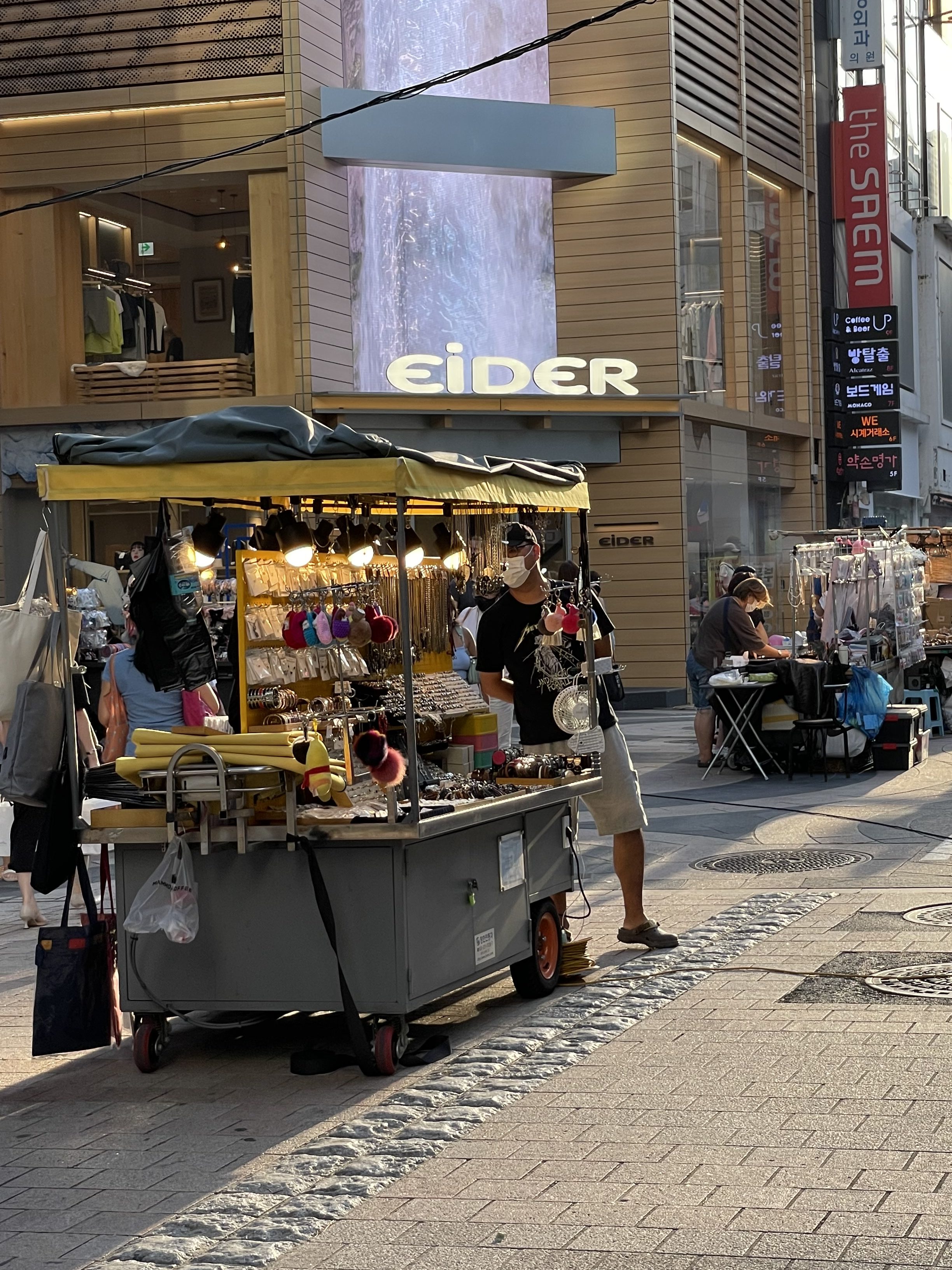 ร้านรองเท้าอย่าง ABC Mart และร้านค้าเสื้อผ้าแฟชันก็มีให้เลือกกันแบบจุกๆ ตอนเย็นๆ จะมีแผงร้าน Street Food ละลานตา เดินไป กินไป ช็อปไป เพลินมากที่สุด นอกจากจะเป็นย่านช้อปปิ้งแบบจุใจ ที่เมียงดงยังเต็มไปด้วยร้านอาหารมากมาย มีทุกซอกทุกซอยไปเลย