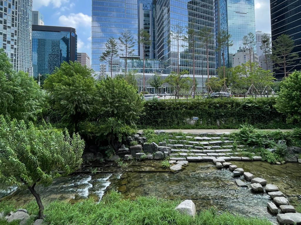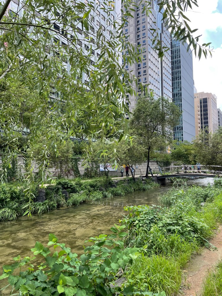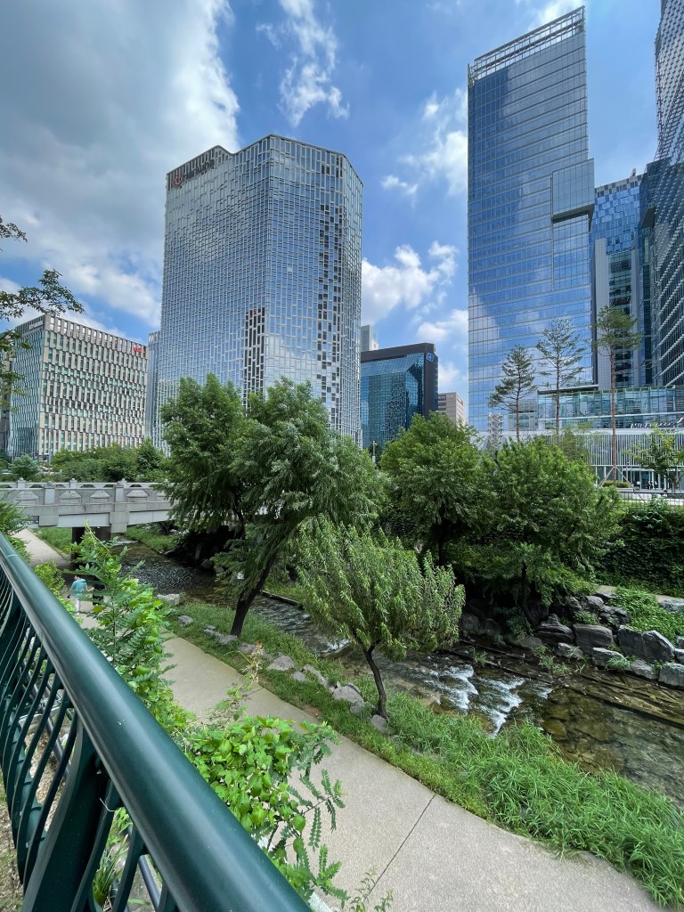 คลองชองกเยชอน หรือ cheonggyecheon Stream เป็นคลองเล็กๆ ที่ทอดยาวกลางเมือง บรรยากาศดี เหมาะสำหรับเดินเล่นพักผ่อนหย่อนใจ หรือจะนั่งเล่น เอาเท้าจุ่มน้ำเบาๆ คลองแห่งนี้ล้อมรอบไปด้วยต้นไม้ มีทางเดินสวยงามตลอดสาย สองข้างทางเต็มไปด้วยตึก ออฟฟิศ โรงแรม และคาเฟ่