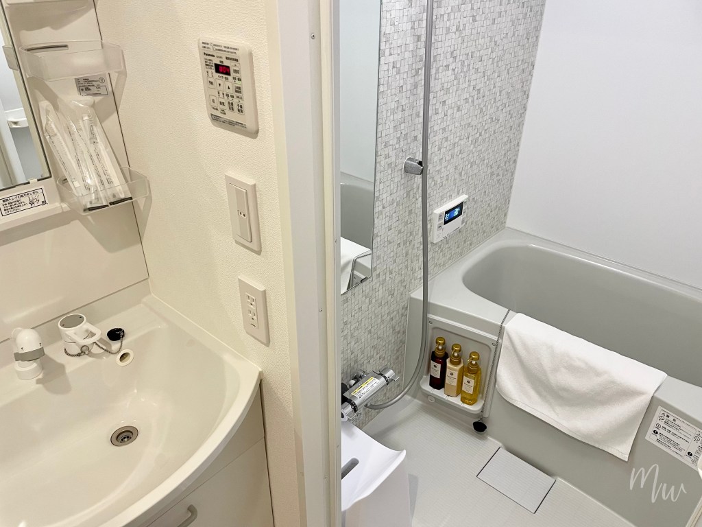 ในส่วนของห้องน้ำก็จะแบ่งเป็นห้องที่มีเฉพาะชักโครก และส่วนที่เป็นห้องอาบน้ำแยกกันแบบสไตล์ญี่ปุ่นดั้งเดิม ในห้องอาบน้ำจะมีอ่างอาบน้ำ อ่างล้างหน้า และที่สำคัญคือมีเครื่องซักผ้าด้วย ถูกใจสำหรับใครที่มาอยู่หลายๆ วัน