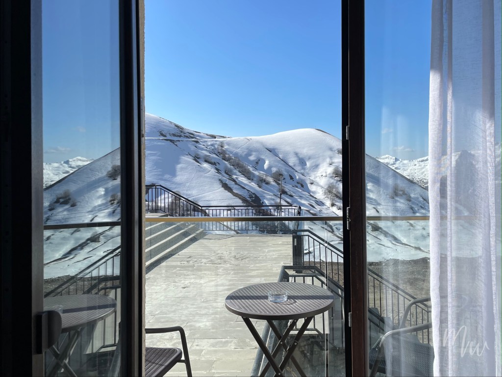 ในส่วนของวิวนั้นไม่ต้องพูดถึง ที่นี่เป็นที่พักที่วิวสวยที่สุดที่เคยพักในจอร์เจียมาทั้งหมด ล้อมรอบไปด้วยเทือกเขาคอเคซัสที่สามารถมองเห็นได้จากระเบียงห้องนั่งเล่นและห้องนอน กับที่พักในราคาพันนิดๆ แต่วิวหลักล้าน ตื่นเช้ามาเจอบรรยากาศแบบนี้ทุกวัน บอกเลยว่าในชีวิตนี้ต้องมาให้ได้สักครั้ง