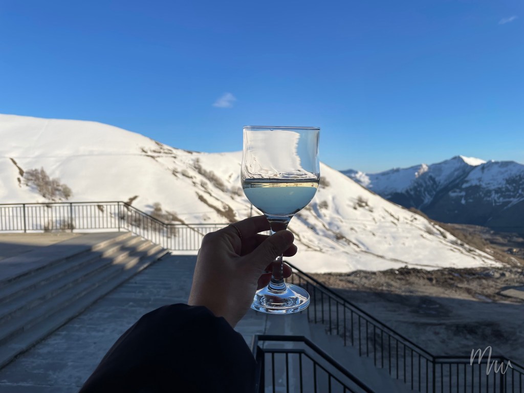ส่วนตัวแล้วชอบห้องนี้มาก นอกจากโซนครัวแล้ว ก็ยังมีโต๊ะกินข้าวที่นั่งได้ 4 คน สำหรับใครที่จะทำงานหรือพวก Digital Nomads ก็สามารถนั่งทำงานได้สะดวกสบายพร้อมกับวิวเทือกเขาคอเคซัสในแบบที่คุ้มค่าเกินราคามาก ที่สำคัญที่นี่เป็นที่พักที่แรกจาก 8 ที่พักในจอร์เจียที่มีไวน์เป็น Welcome Gift ให้ด้วย เป็นสิ่งเล็กๆ จาก Host ที่เราประทับใจมาก