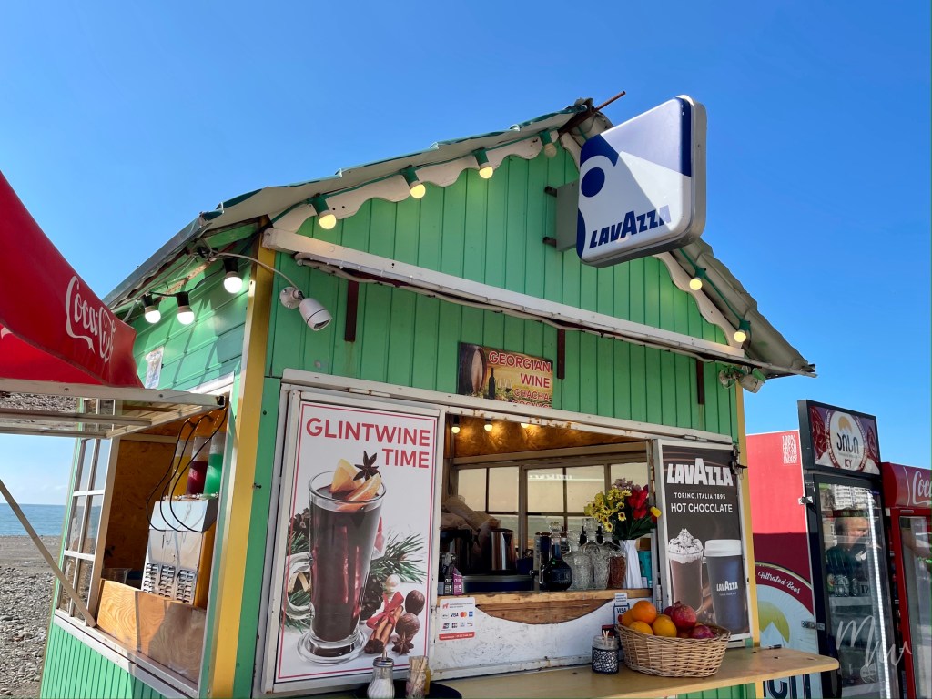 สองข้างทางก็จะเต็มไปด้วยร้านขายของเล็กๆ ที่ขายขนม น้ำผลไม้ ไอติม ไปจนถึงไวน์จอร์เจียน แล้วก็ยังมีเครื่องเล่นแบบสวนสนุกไม่ว่าจะเป็นรถไฟเหาะหรือจะ Swing Ride ที่เห็นคนเล่นกันเยอะ แล้วก็ Viking ซึ่งตั้งอยู่บนหาดวิวทะเลปังๆ ไปอีก