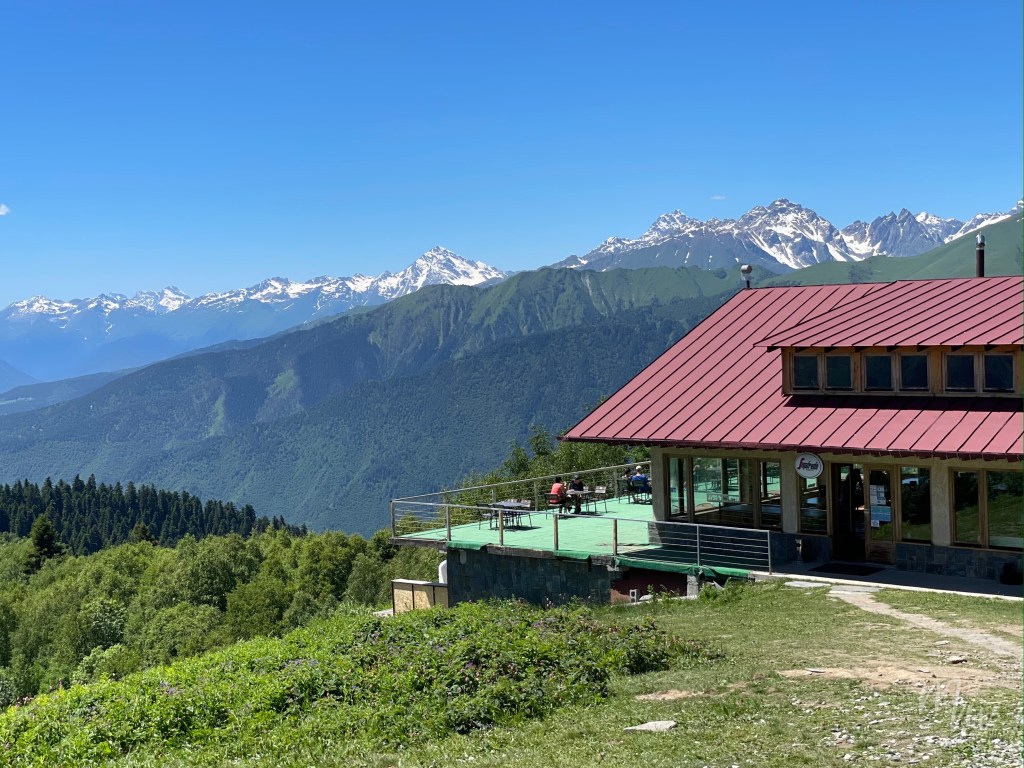 ด้านบนของสถานี Zuruldi ก็จะมีคาเฟ่ ซึ่งมีทั้งกาแฟและอาหาร วิวก็คงไม่ต้องพูดถึง คอเคซัสที่ยังมีหิมะปกคลุมอยู่บ้างในช่วงเดือนกรกฎาคมที่เป็น Summer และ High Season ของที่นี่เลย