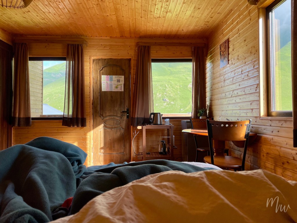 ที่พักที่เราเลือกก็คือ Ushguli Cabins ซึ่งจะเป็นที่พักแบบ Cabin หลังเล็กๆ ส่วนตัว ที่ตั้งอยู่บนเนินเขา ห่างจากตัวหมู่บ้านเพียงไม่กี่ก้าวเท่านั้นเอง