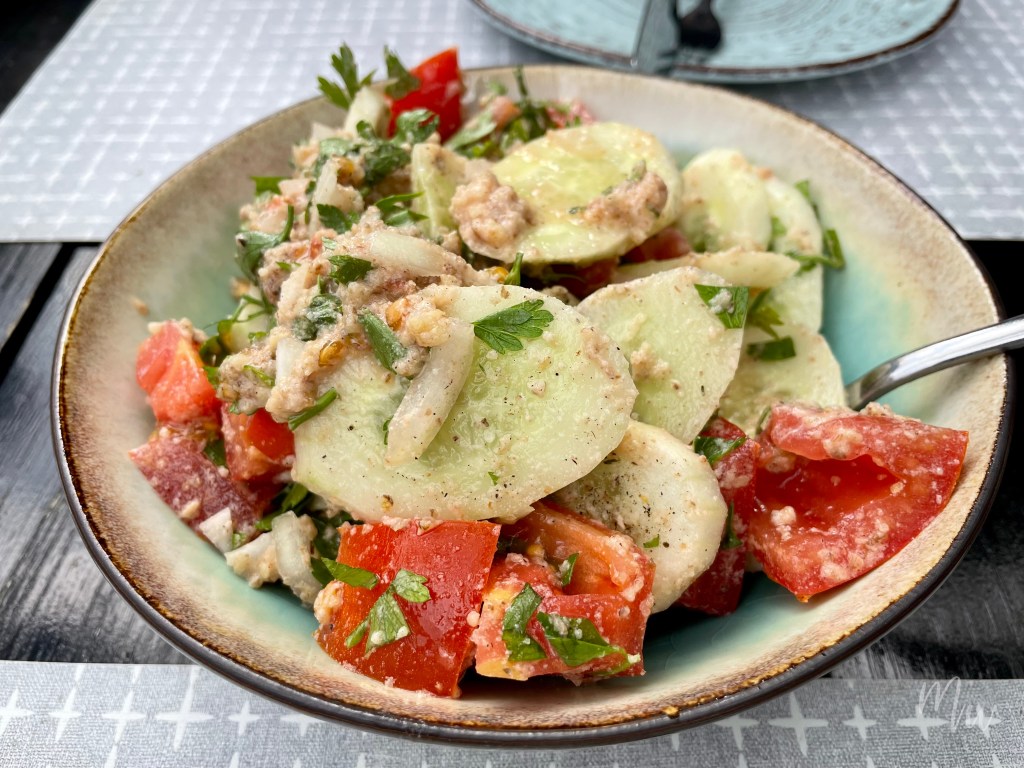 ในทุกๆ มื้อไม่ว่าจะเป็นอาหารเช้า เที่ยงหรือเย็น คนจอร์เจียจะชอบทานแตงกวาและมะเขือเทศฝานเป็นชิ้นสดๆ หรืออาจทำเป็นสลัดคลุกกับซอสวอลนัท (Tomato and Cucumber Salad with Walnut) อีกหนึ่งเมนูที่แนะนำให้ต้องลอง