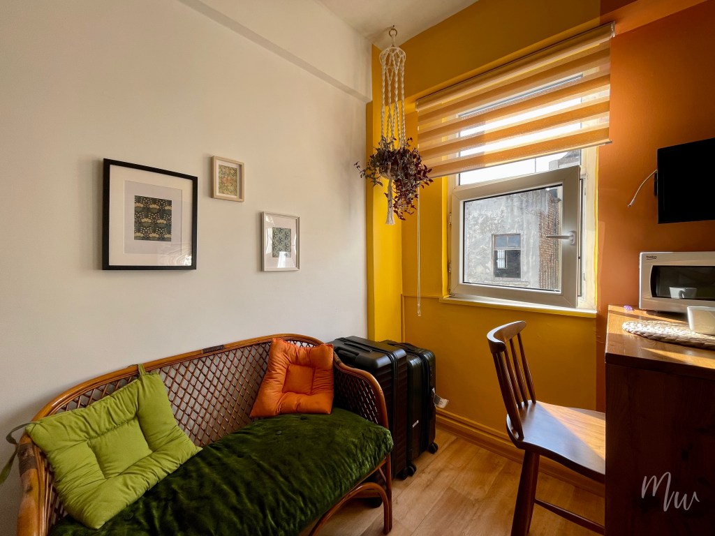 อพาร์ทเมนท์รีโนเวทแบบ Studio ที่ตั้งอยู่บนชั้น 3 ของตึกที่ไม่ได้ใหม่มาก และที่นี่ก็ไม่ได้มีลิฟท์อีกเหมือนกัน ใครมีกระเป๋าใบใหญ่อาจจะต้องออกกำลังกายกันหน่อย ภายในห้องตกแต่งแนว Cozy สบายๆ มีโซนครัว มีโซฟานั่งเล่นและโต๊ะสำหรับกินข้าว สามารถมองเห็นถนนเล็กๆ ซึ่งเป็นโซนที่อยู่อาศัย บรรยากาศเงียบสงบ และที่นี่มีเครื่องซักผ้าให้ใช้บริเวณส่วนกลางชั้น 1 เผื่อใครจะมาอยู่นานๆ