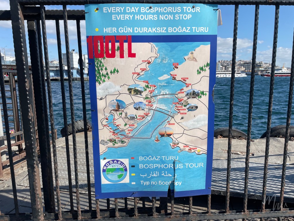 จุดขึ้นเรือนั้นจะอยู่บริเวณเมโทรสถานี Eminönu ติดกับ Golden Horn ซึ่งจะมีป้ายแผนที่ล่องเรือติดแบบนี้ในราคาคนละ 100 TL หรือราวๆ 120 บาทเท่านั้นเอง สามารถ Walk-in เข้าไปได้เลย โดยเรือจะออกทุกๆ 1 ชั่วโมง