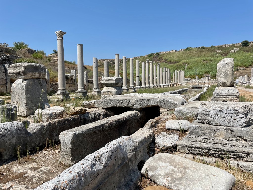 ต่อจาก Acropolis เราจะเดินกลับมาบริเวณสี่แยก แล้วเลี้ยวขวาเพื่อเข้าสู่ถนน East-West โดยเดินไปทางตะวันตก ซึ่งถนนสายนี้ก็จะคล้ายๆ กับถนนสาย North-South ที่ด้านข้างเรียงรายไปด้วยหินเสากลม มีทางน้ำไหลด้านข้างไปตามสายถนน ไปจนถึงทางเดินเท้าและร้านค้าที่เรียงรายอยู่เป็นห้องๆ