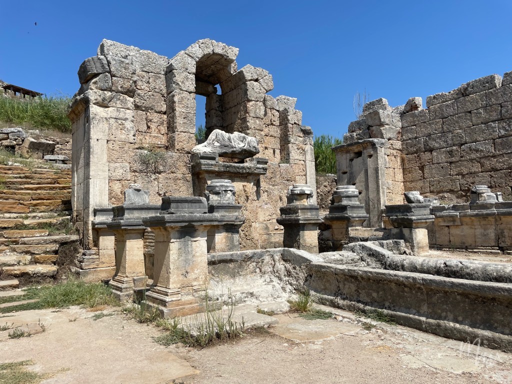 บริเวณก่อนทางขึ้นจะมีน้ำพุที่มีรูปปั้นของ Kestros เทพเจ้าแห่งแม่น้ำ (The River God) ซึ่งอันที่จริงแล้วรูปปั้นของ Kestros ถูกล้อมรอบด้วยรูปปั้นของเทพเจ้ากรีกองค์อื่นๆ ด้วย ก็คือ ซูส (Zeus) อาร์เตมิส (Artemis) และอะพอลโล (Apollo) แต่ปัจจุบันได้ถูกเก็บไว้ในพิพิธภัณฑ์อันทาเลียพร้อมกับรูปปั้นของจักรพรรดิฮาดริอานุส จึงคาดว่าน้ำพุ Kestros แห่งนี้น่าจะถูกสร้างขึ้นในยุคของจักรพรรดิฮาดริอานุส (ช่วงปีคริสต์ศักราช 117-138)