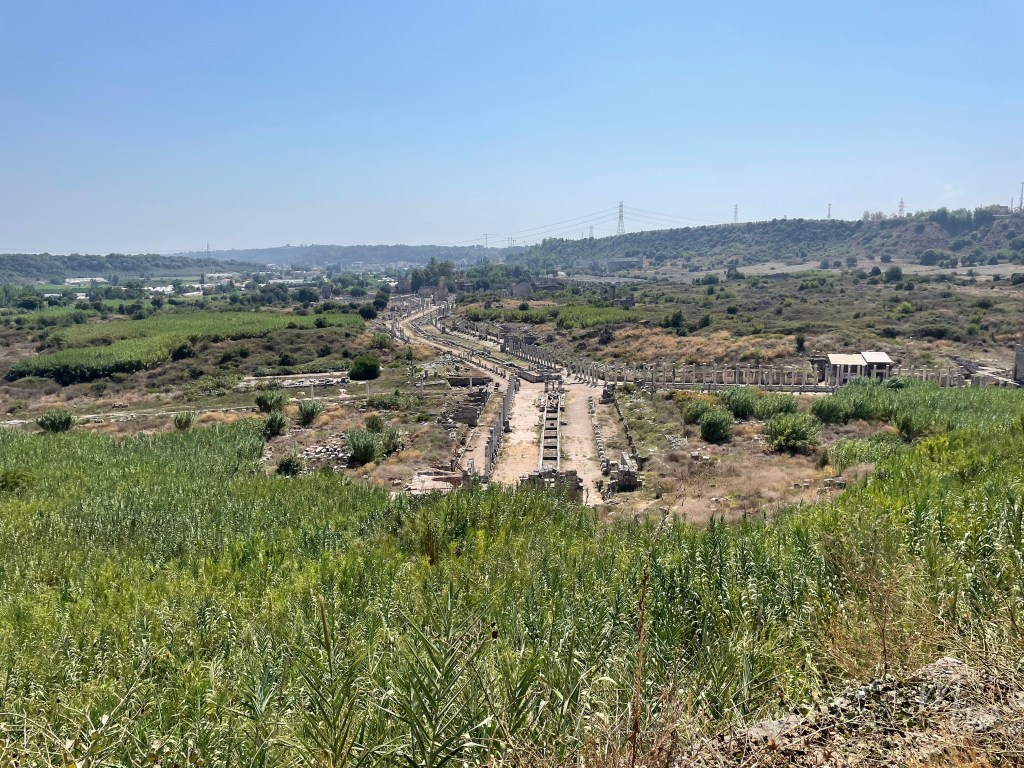 จากบริเวณน้ำพุที่มีรูปปั้น Katros สามารถเดินขึ้นเขามาราว 10 นาที ก็จะมีจุดนั่งพักชมวิวเมืองโบราณ Perge ที่มองเห็นถนนสายหลักทั้งสองสายก็คือ North-South และ East-West และจากบริเวณนี้น่าจะสามารถเดินขึ้นไปได้อีกเพื่อไปยัง Acropolis แต่เหลือเพียงแค่ร่องรอยบางส่วนเท่านั้น