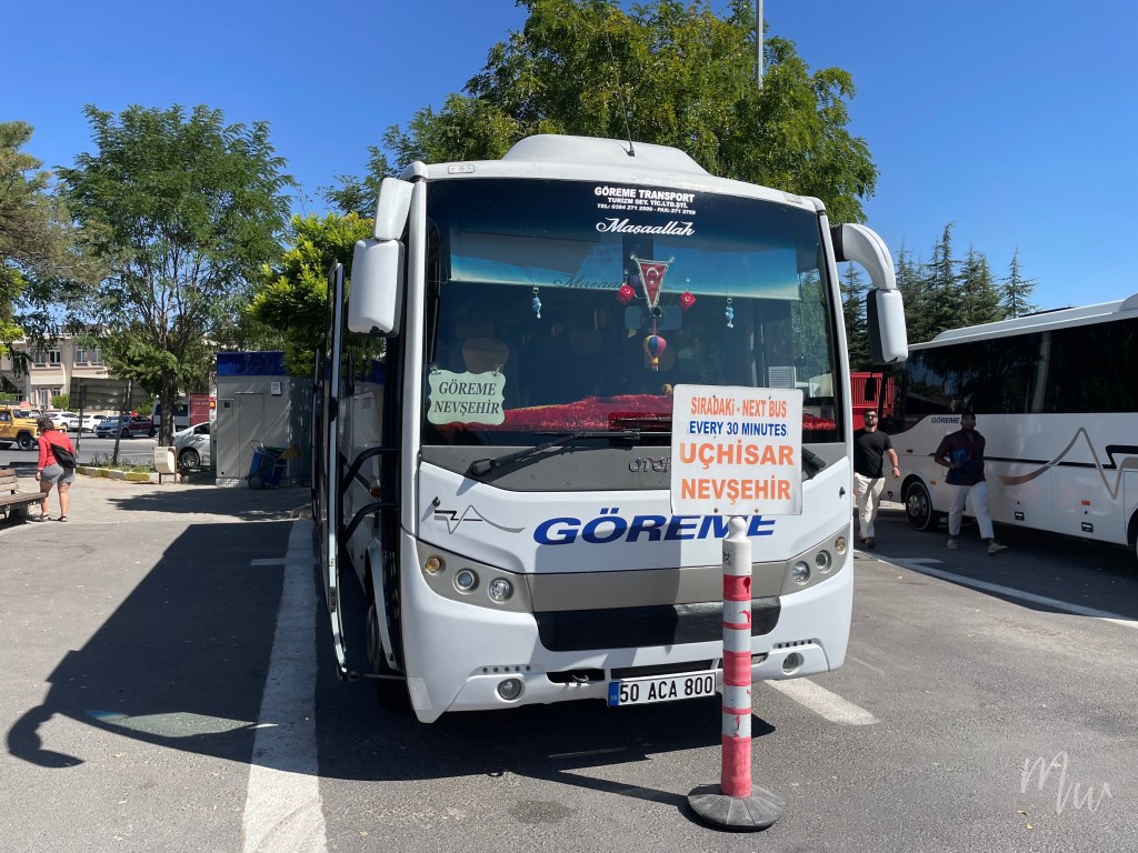 ตรงจุดขึ้นรถจะมีป้ายเขียนว่า “Göreme Public Bus” โดยเค้าจะมีจุดจอดอยู่ 2 จุดคือ Uchisar และ Nevşehir ราคา 20 ลีราเท่ากัน (อ้างอิงราคาจากปี 2023) ตัวรถบัสจะคล้ายๆ กับ Minibus มีออกทุก 30 นาที รอบเช้าสุดคือ 07:30 และรอบสุดท้ายคือ 19:00 แนะนำให้ไปช่วงเช้าอากาศกำลังดี คนยังไม่เยอะมาก