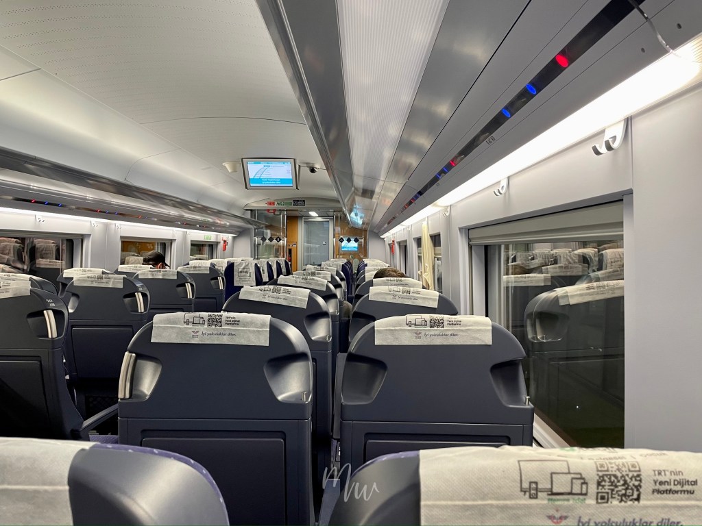 รถไฟ Ankara – Istanbul เป็นรถไฟชั้นเดียว ตัวขบวนค่อนข้างใหม่เลย ภายในกว้างขวาง สะอาด มีที่เก็บกระเป๋า Luggage ใบใหญ่และที่วางของด้านบน